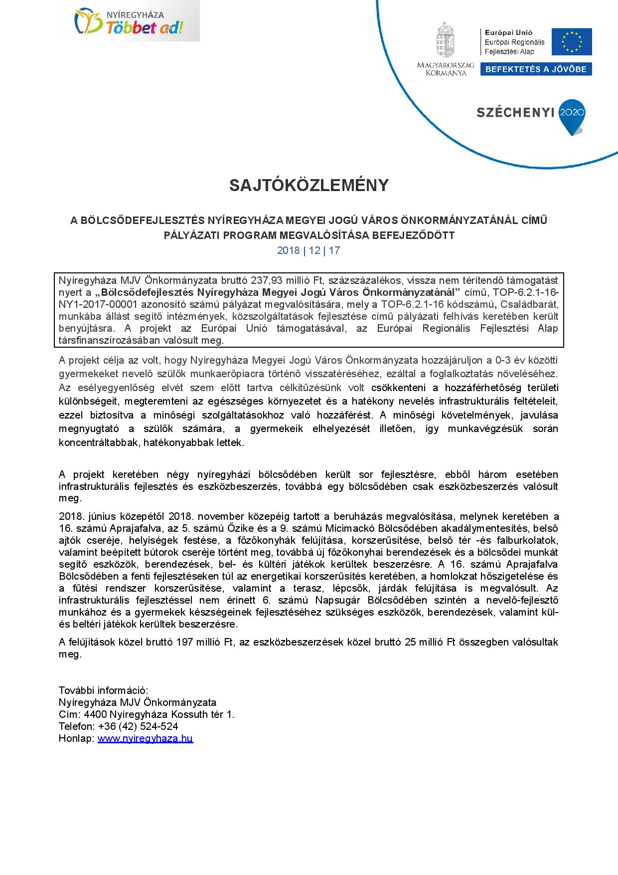 Nyíregyháza Megyei Jogú Város Önkormányzata bruttó 237,93 millió Ft, százszázalékos, vissza nem térítendő támogatást nyert a „Bölcsődefejlesztés Nyíregyháza Megyei Jogú Város Önkormányzatánál" című, TOP-6.2.1-16-NY1-2017-00001 azonosító számú pályázat megvalósítására, mely a TOP-6.2.1-16 kódszámú, Családbarát, munkába állást segítő intézmények, közszolgáltatások fejlesztése című pályázati felhívás keretében került benyújtásra.