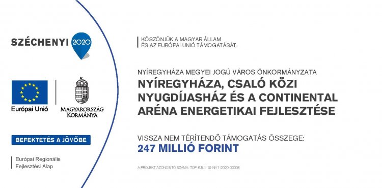 Nyíregyháza MJV Önkormányzata bruttó 247.000.000 Ft, 100%-os támogatási intenzitású, vissza nem térítendő támogatást nyert az „Nyíregyháza, Csaló közi nyugdíjasház és a Continental Aréna energetikai fejlesztése” című, TOP-6.5.1-19-NY1-2020-00003 azonosítószámú pályázat megvalósítására, mely a TOP-6.5.1-19 kódszámú, Önkormányzati épületek energetikai korszerűsítése című felhívás kapcsán került benyújtásra. A projekt az Európai Unió támogatásával, az Európai Regionális Fejlesztési Alap társfinanszírozásában valósult meg.