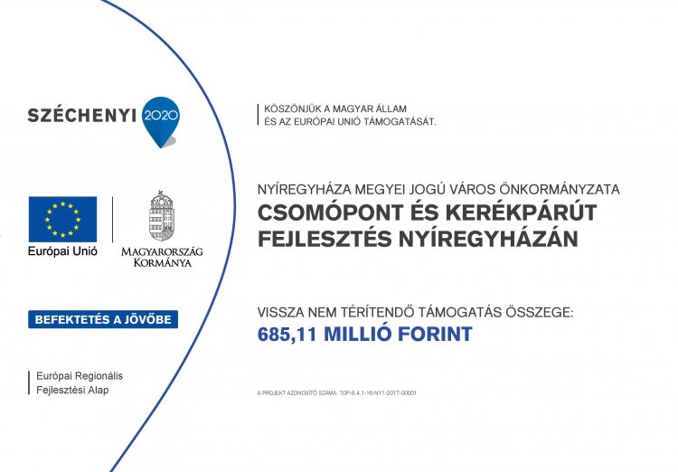 Nyíregyháza MJV Önkormányzata bruttó 685.112.500 Ft, százszázalékos, vissza nem térítendő támogatást nyert az „Csomópont és kerékpárút fejlesztés Nyíregyházán” című, TOP-6.4.1-16-NY1-2017-00001 azonosítószámú pályázat megvalósítására, mely a TOP-6.4.1-16 kódszámú, Fenntartható városi közlekedésfejlesztés című felhívás kapcsán került benyújtásra. A projekt az Európai Unió támogatásával, az Európai Regionális Alap társfinanszírozásában valósul meg.
