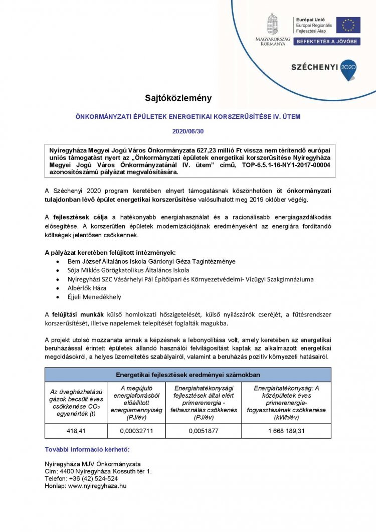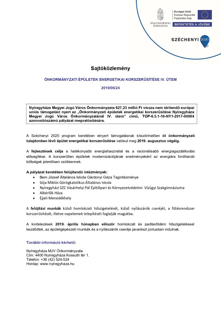 Nyíregyháza Megyei Jogú Város Önkormányzata 627.227.209 forint 100%-os intenzitású támogatást nyert az „Önkormányzati épületek energetikai korszerűsítése Nyíregyháza Megyei Jogú Város Önkormányzatánál IV. ütem” című, TOP-6.5.1-16-NY1-2017-00004 azonosítószámú projekt megvalósítására. Az Önkormányzat tulajdonában lévő épületek meghatározó része energetikailag elavult, üzemeltetése költséges, így korszerűsítésük elengedhetetlen. A fejlesztések célja a hatékonyabb energiahasználat és a racionálisabb energiagazdálkodás elősegítése. Az épületek modernizációjának eredményeként az energiára fordítandó költségek jelentős csökkenése várható.