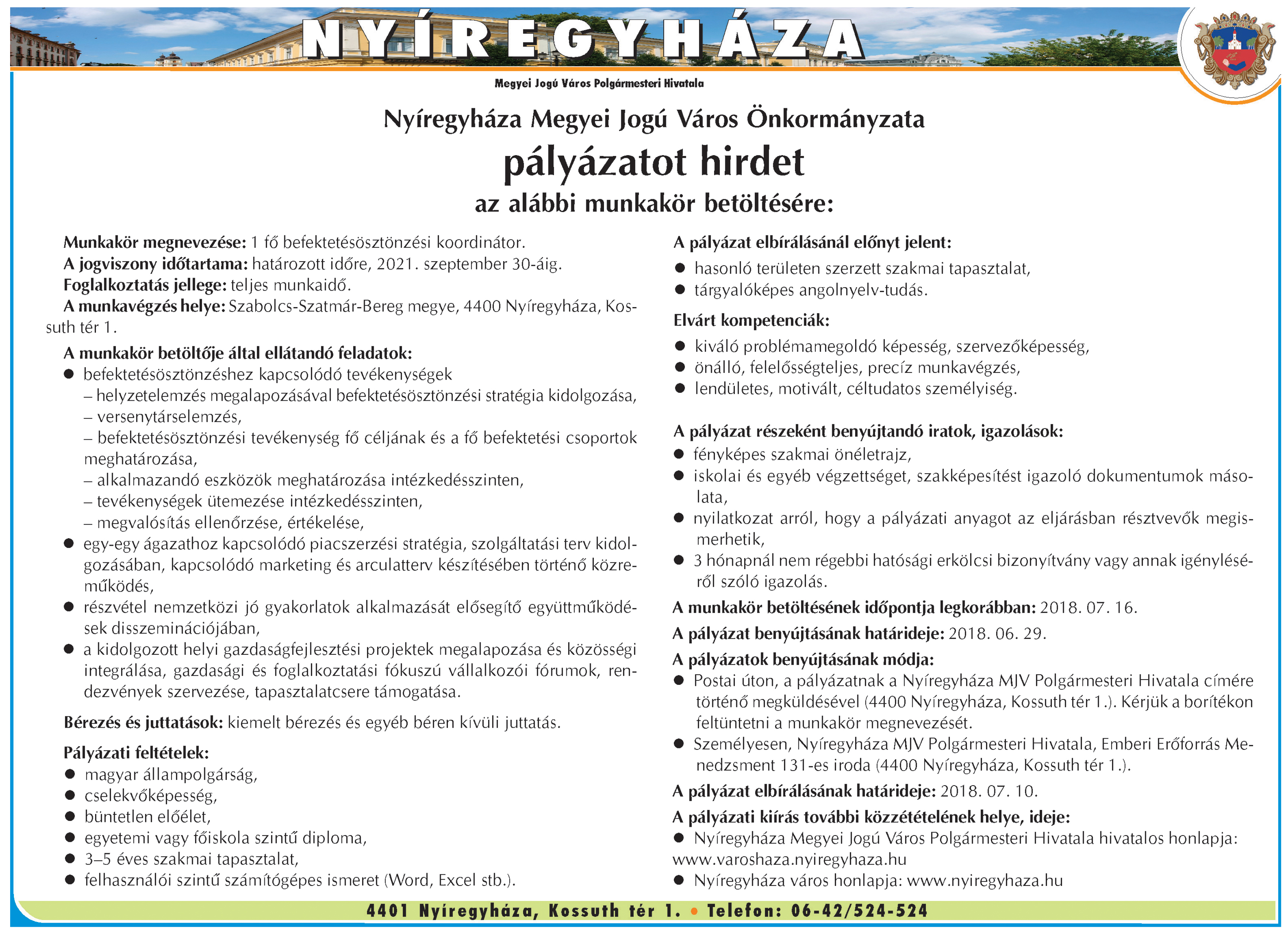 Pályázati felhívás befektetésösztönzési koordinátor pozíció betöltésére