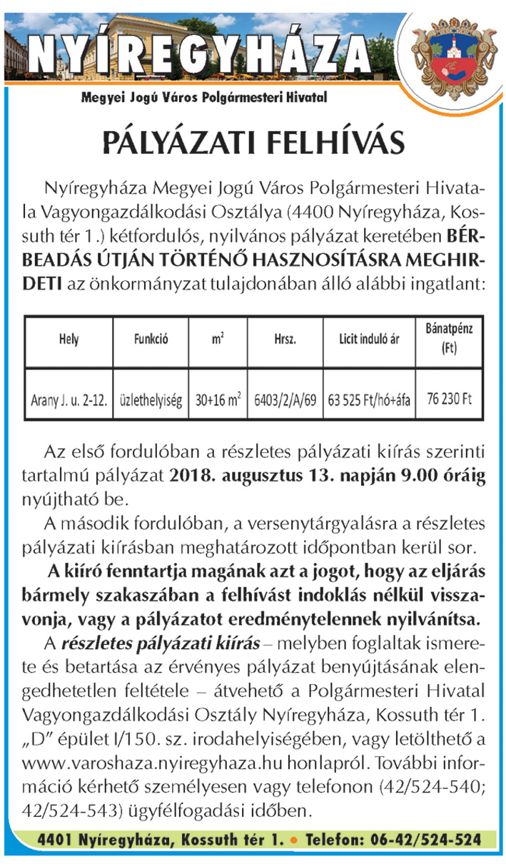 Pályázati felhívás bérbeadás útján történő hasznosításra