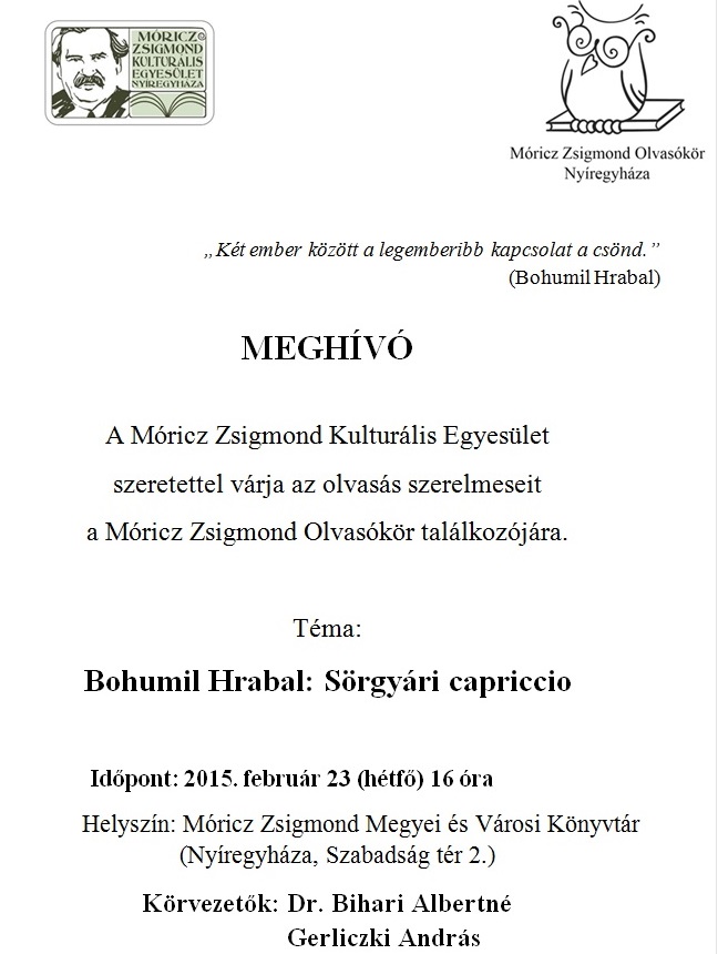 Hrabal népszerű műve, a Sörgyári capriccio lesz a témája a Móricz Zsigmond Olvasókör februári találkozójának. Az olvasás szerelmeseit február 23-án (hétfőn) 16 órára várják a Móricz Zsigmond Könyvtárba.
