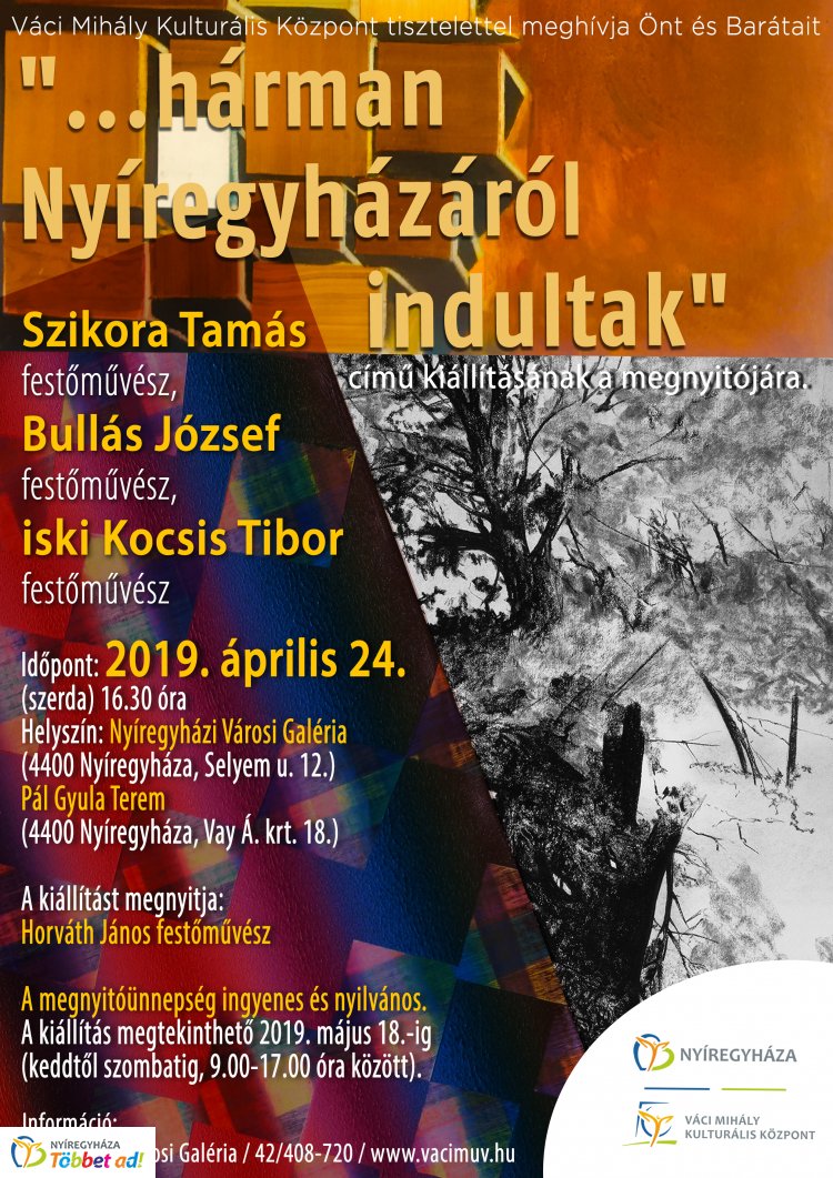 Szikora Tamás, Bullás József és iski Kocsis Tibor festőművészek közös tárlata várja a látogatókat április 24-től május 18-ig a Nyíregyházi Városi Galériában és a Pál Gyula Teremben.