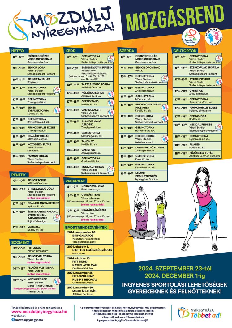 "A 11 éve töretlen sikersorozat folytatódik: szeptember 23-tól indul a Mozdulj Nyíregyháza! újabb évada! Ebben a félévben heti 59 foglalkozás érhető el a város 29 helyszínén, köztük a Városi Stadion vadonatúj Szabadidősport-központjában – természetesen továbbra is ingyenesen. A mozgásrend részletei láthatók a plakáton és folyamatosan elérhetők a www.mozduljnyiregyhaza.hu oldalon. Sportos, egészséges őszt kívánok mindenkinek!"