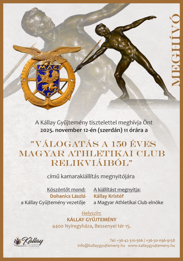 A magyar sporttörténelem egyik legpatinásabb intézménye, a Magyar Athletikai Club (MAC) idén ünnepli fennállásának 150. évfordulóját. A jeles alkalomból a Kállay Gyűjtemény különleges kamarakiállítást rendez „Válogatás a 150 éves Magyar Athletikai Club relikviáiból” címmel, amelynek megnyitójára 2025. november 12-én, szerdán 11 órakor kerül sor Nyíregyházán.