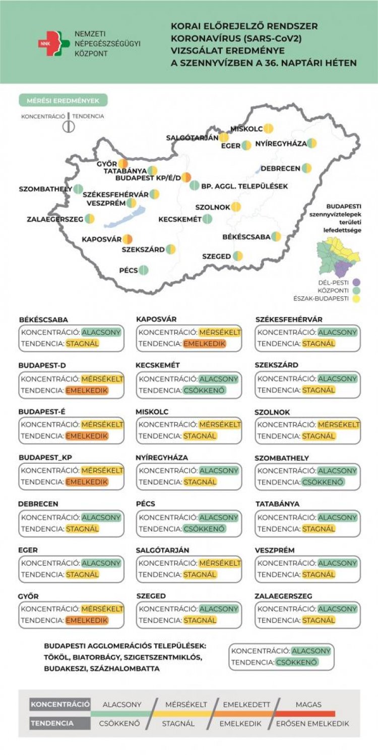 Az egyes városok szennyvíz mintái közül aktuálisan növekszik Budapest, Győr és Kaposvár, míg csökkenés tapasztalható a budapesti agglomerációs települések (Tököl, Biatorbágy, Szigetszentmiklós, Budakeszi, Százhalombatta) közös mintája, továbbá Kecskemét, Pécs és Szombathely esetében. A vizsgált városok többségében (14 helyen) továbbra is alacsony a vírus-koncentráció, míg 8 mintavételi helyen a mérsékelt tartományba esik.
