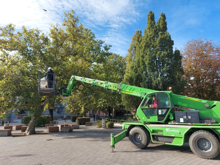 A cég munkatársai elkezdték a karácsonyi díszeket felhelyezni a Kossuth téri fákra. A munkát emelőkosárból végezték.