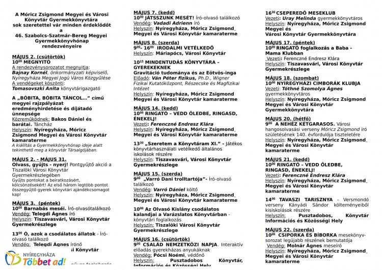 46. Szabolcs-Szatmár-Bereg megyei Gyermekkönyvhónap rendezvényei