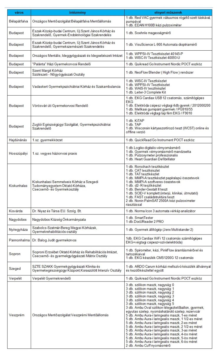 A nyíregyházi Szabolcs-Szatmár-Bereg Megyei Kórház Gyermekrehabilitációs Osztályán ezentúl állítógép segít a járásképtelen gyermekeket vertikális helyzetben tartani, a nagydobosi háziorvosi rendelőben a fertőzések kiszűrését segítik az elnyert eszközök, a Záhonyt és térségét ellátó gyermekorvosi praxis által elnyert automata vérkép analizátor pedig a vérszegénységet, a gyulladásokat és a fertőző betegségeket tudja gyorsan és hatékonyan diagnosztizálni.