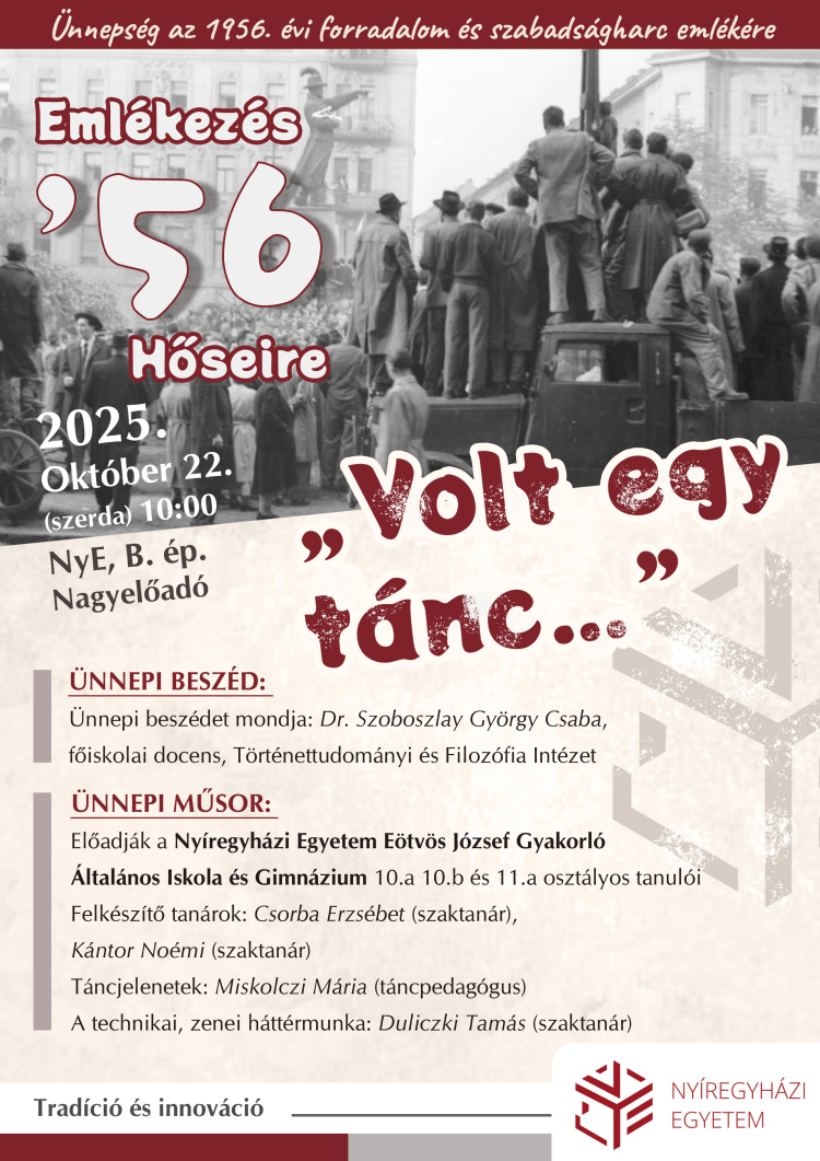 A Nyíregyházi Egyetem tisztelettel hívja az érdeklődőket az 1956-os forradalom és szabadságharc tiszteletére rendezett ünnepi megemlékezésére.