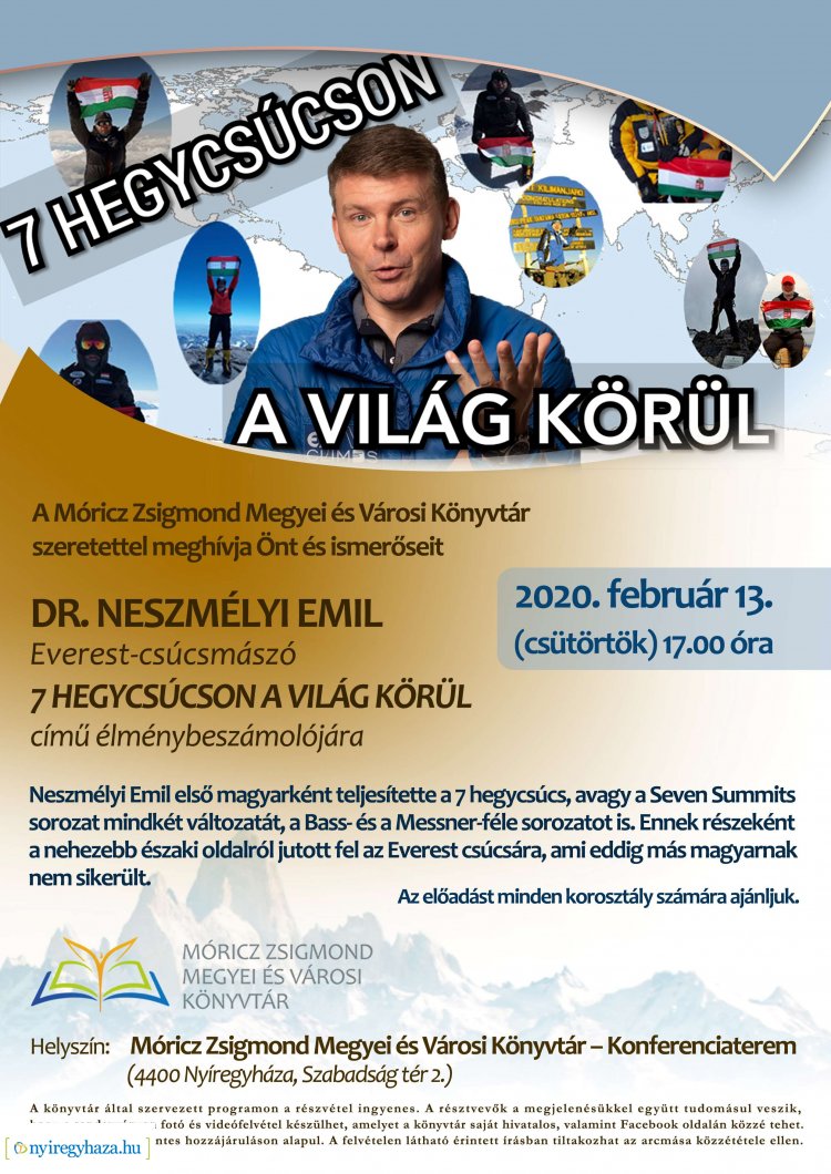 Dr. Neszmélyi Emil első magyarként teljesítette a 7 hegycsúcs, avagy a Seven Summits mindkét változatát, a Bass- és a Messner-féle sorozatot. Élményeiről mesél február 13-án Nyíregyházán, a Móricz Zsigmond könyvtárban.