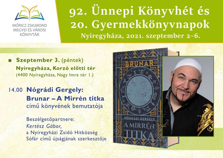 Nógrádi Gergely: Brunar- A Mirrén titka című könyvének bemutatójára várják az irodalombarátokat szeptember 3-án, a Korzó előtti térre. A szerzővel Kertész Gábor beszélget.