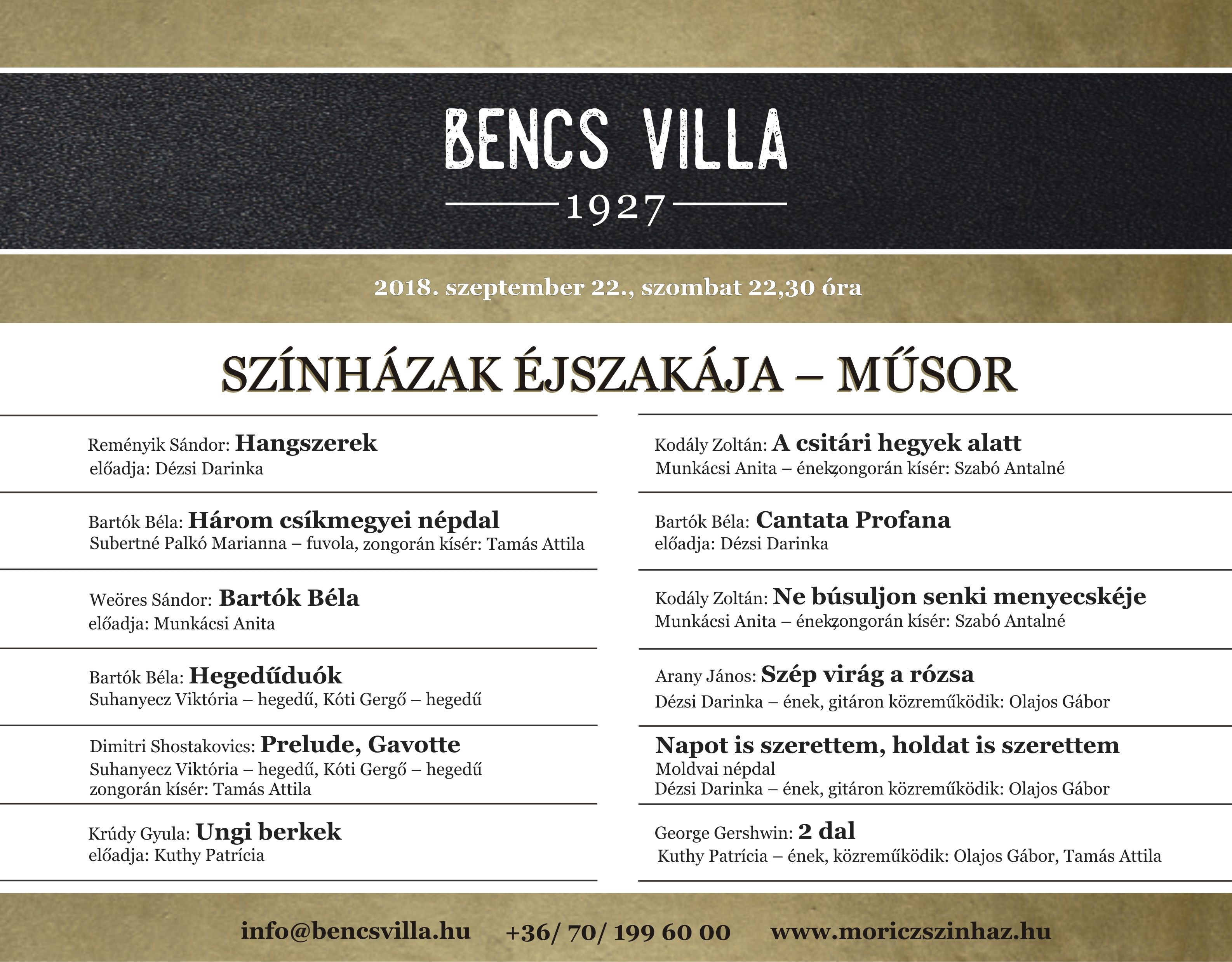 A zene is egyfajta színház, hiszen még a szólista is párbeszédet folytat, legalább két síkon egyszerre: hangszerével és a hallgatóival. Viszonyt alakít ki, történetet mesél, játszik el, él meg. Ezen a különleges, ünnepi éjszakán, amikor színház és közönség, átadó és befogadó, néző és hallgató a szokottnál személyesebb, közvetlenebb találkozására kerül sor, magától értetődőnek tűnt, hogy színházunk legújabb kulturális műhelyében, a megújult és megszépült Bencs-villában egy olyan műsorral „avassuk” be az érdeklődőket a pódiumműfaj sajátos világába, amely a zene és az irodalom gyöngyszemeit fűzi egy csokorba.