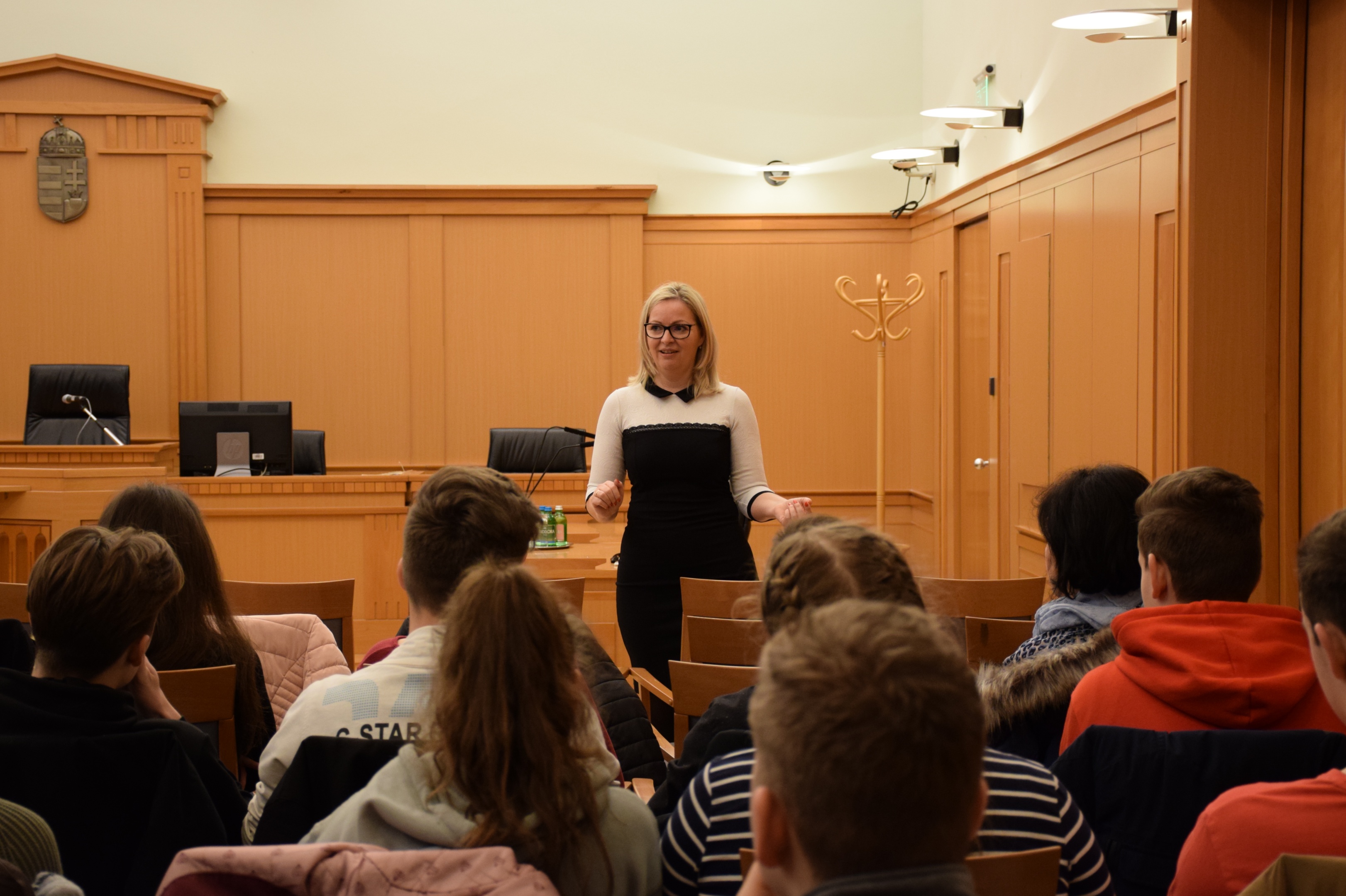 A mintegy 35 fős hallgatóság előtt Gutyánné dr. Orosz Edina, a program koordinátora tartott előadást az igazságszolgáltatás szervezetéről, felépítéséről, a bírósági eljárások, egyes tárgyalások sajátosságairól.