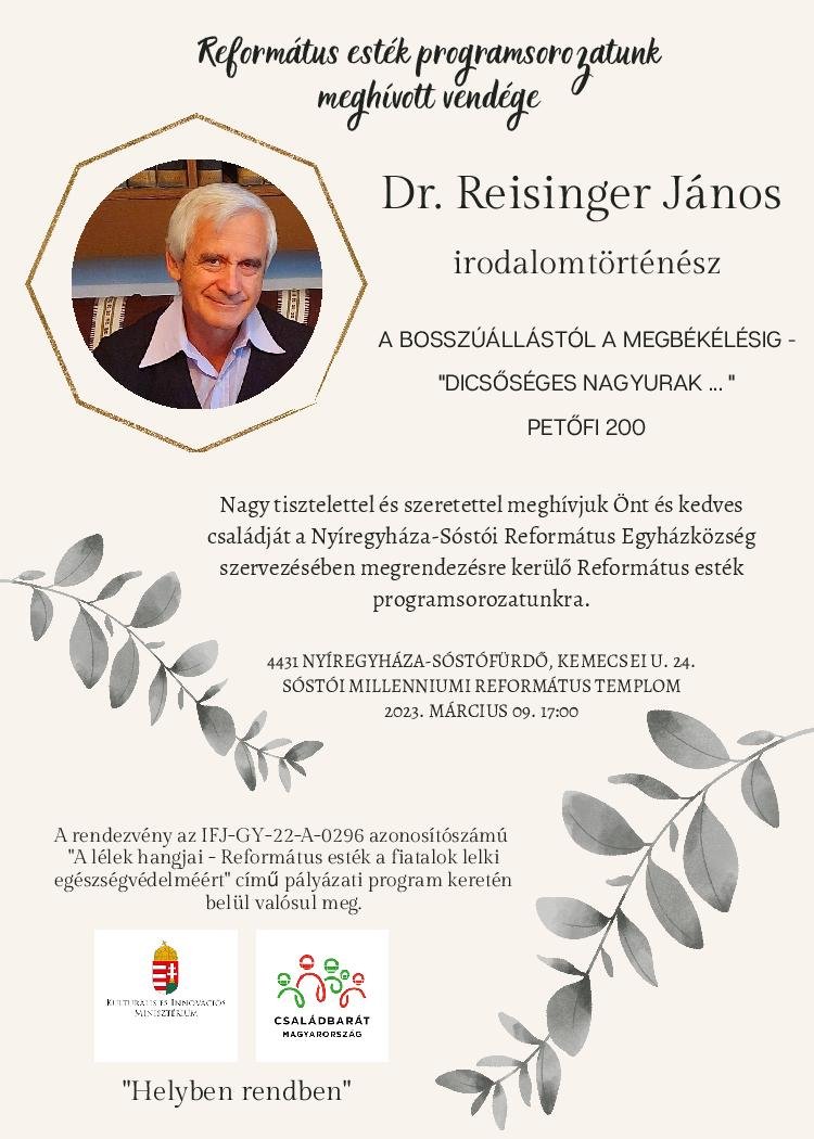 A Refomátus esték programsorozat meghívott vendége dr. Reisinger János irodalomtörténész lesz, aki A bosszúállástól a megbékélésig – "Dicsőséges nagyurak..." címmel tart előadást a Sóstói Milleniumi Református Templomban.