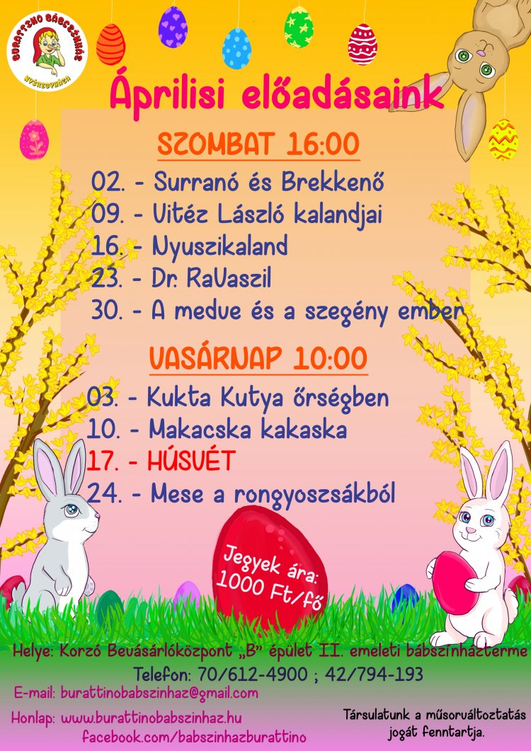A Burattino Bábszínház előadásai áprilisban is várják a családokat. A szombat délutáni és vasárnap délelőtti bábelőadások a Korzóban várják az érdeklődőket.