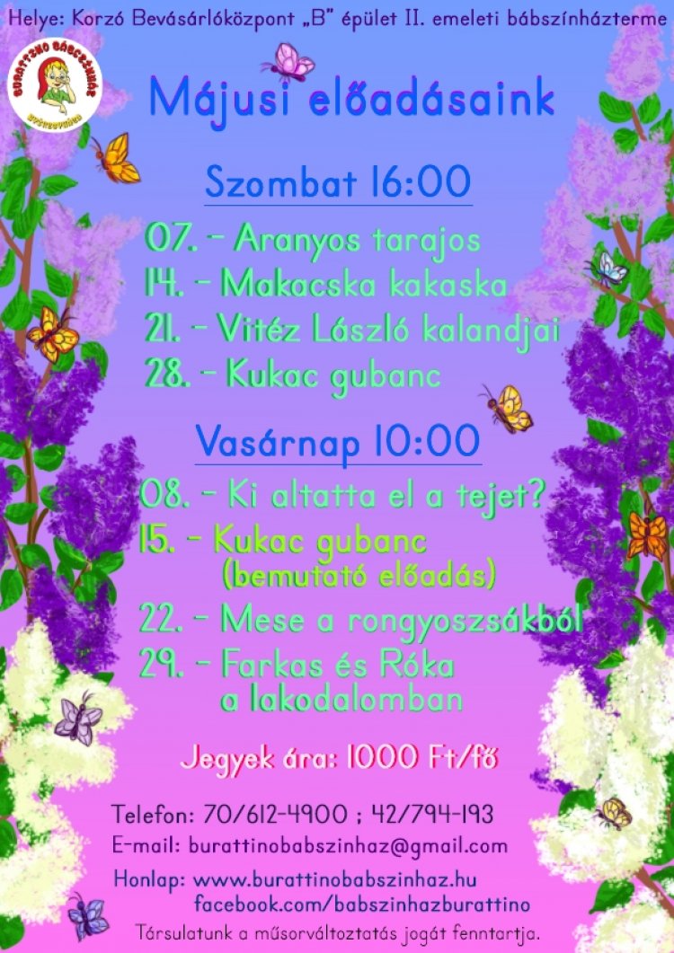 A Burattino Bábszínház előadásai májusban is várják a családokat. A szombat délutáni és vasárnap délelőtti bábelőadások a Korzóban várják az érdeklődőket.