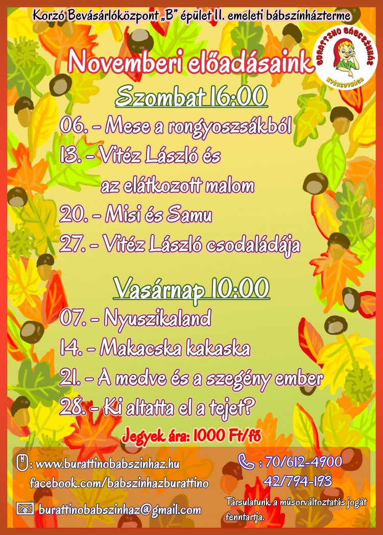 A Burattino Bábszínház előadásai novemberben is kellemes kikapcsolódást ígérnek a családoknak minden hétvégén.