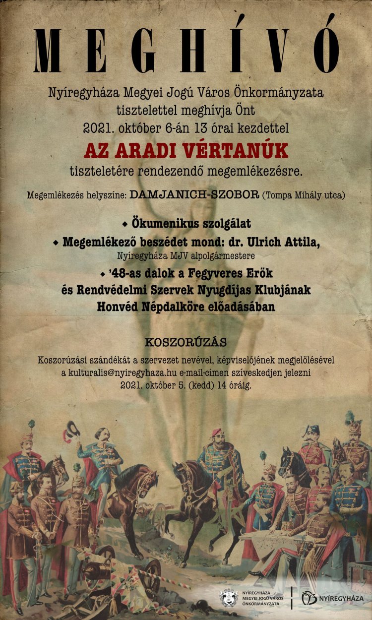 Nyíregyháza Megyei Jogú Város Önkormányzata ezen a napon a Damjanich-szobornál rendez megemlékezést, 13 órai kezdettel. Az ökumenikus szolgálat után dr. Ulrich Attila alpolgármester mond megemlékező beszédet, majd a Fegyveres Erők és Rendvédelmi Szervek Nyugdíjas Klubjának Honvéd Népdalköre ad elő '48-as dalokat. A megemlékezés koszorúzással zárul.