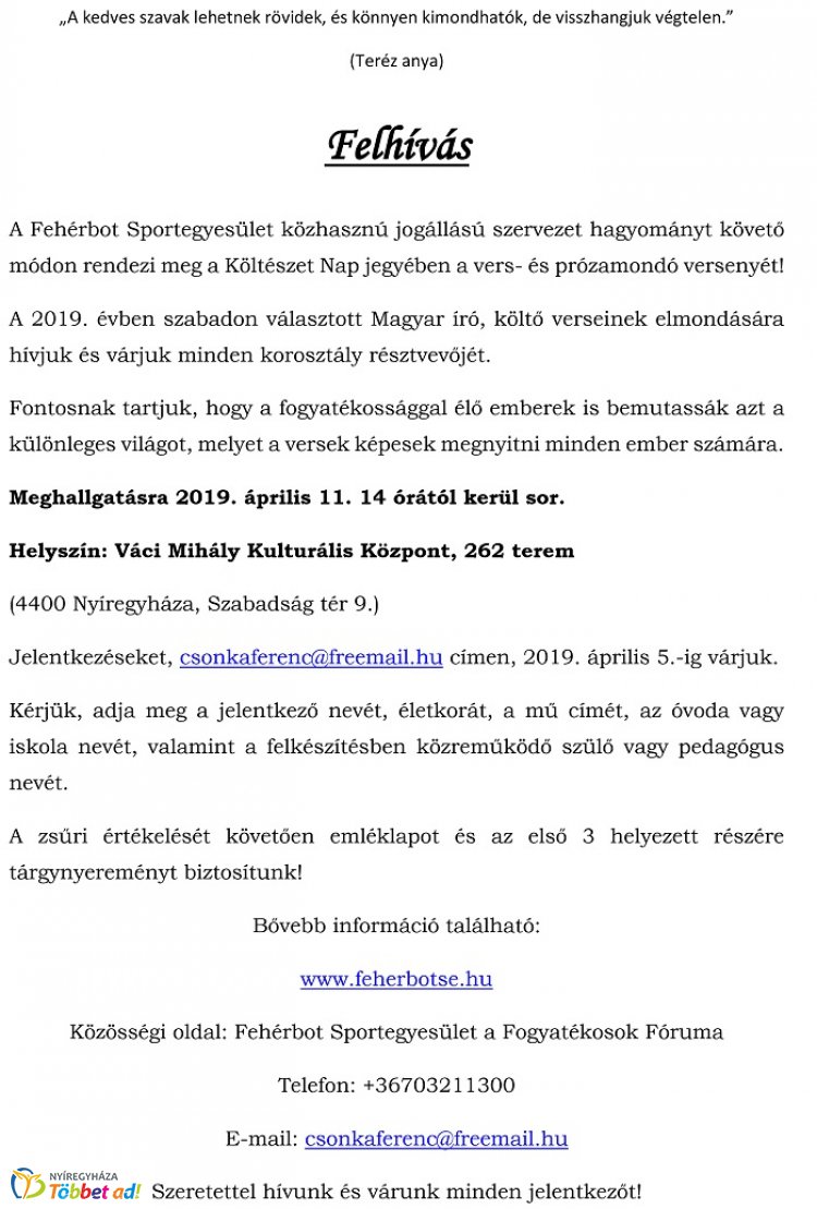 A Fehérbot Egyesület szavalóversennyel egybekötött kiállításmegnyitója a Költészet Napján