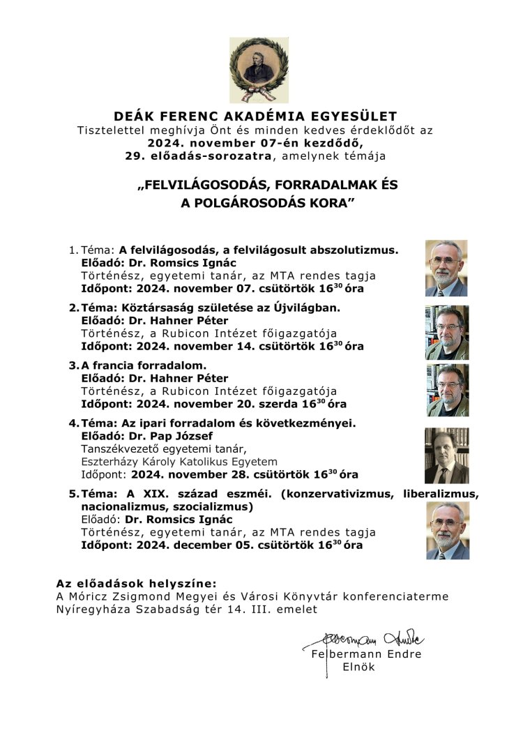 A felvilágosodás, a felvilágosult abszolutizmus, ezzel az előadással kezdődik a Deák Ferenc Akadémia Egyesület 29. előadás-sorozata. Az első előadó dr. Romsics Ignác lesz, aki november 7-én, 16.30-tól tart előadást a könyvtár konferenciatermében.