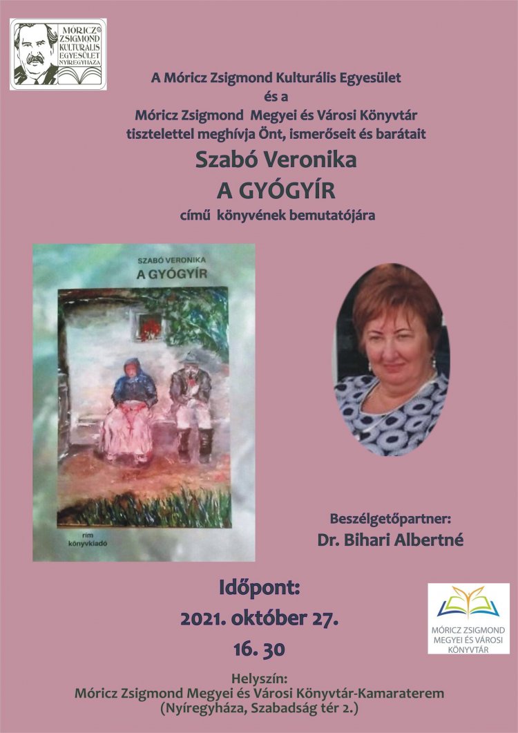 A Móricz Zsigmond Kulturális Egyesület Szabó Veronika: A gyógyír című első novelláskötetének bemutatójára várja az érdeklődőket október 27-én, a Móricz Zsigmond könyvtár kamaratermébe. A szerző beszélgetőpartnere dr. Bihari Albertné lesz.