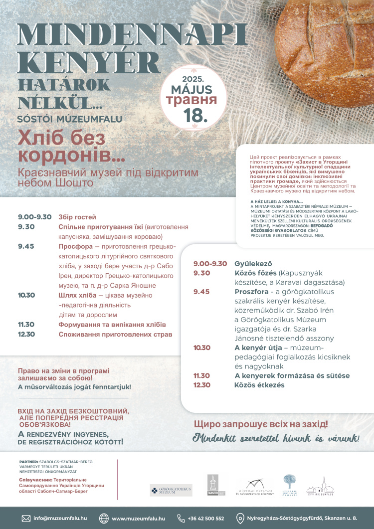 Május 18-án, a Múzeumi Világnapon a MINDENNAPI KENYÉR HATÁROK NÉLKÜL… címmel közös karavaj dagasztásra, kenyérsütésre és szakrális kenyér készítésére várjuk vendégeinket.