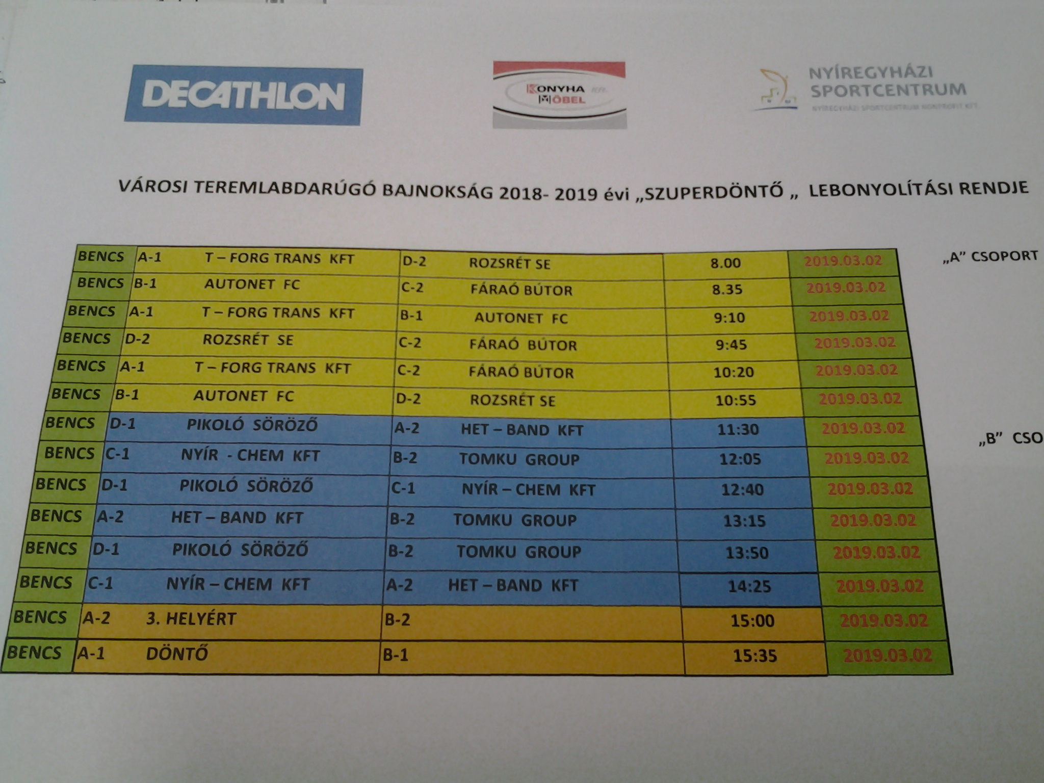 Mellettük a NYÍR- CHEM KFT a TOMKU GROUP és a továbbra is veretlen FÁRAÓ BÚTOR csapatai kerültek be a március 2-án szombaton reggel nyolckor kezdődő Szuperdöntőbe. Helyszín a Zrinyi Gimnázium Tiszavasvári úti Bencs csarnoka. Íme az időbeosztás: