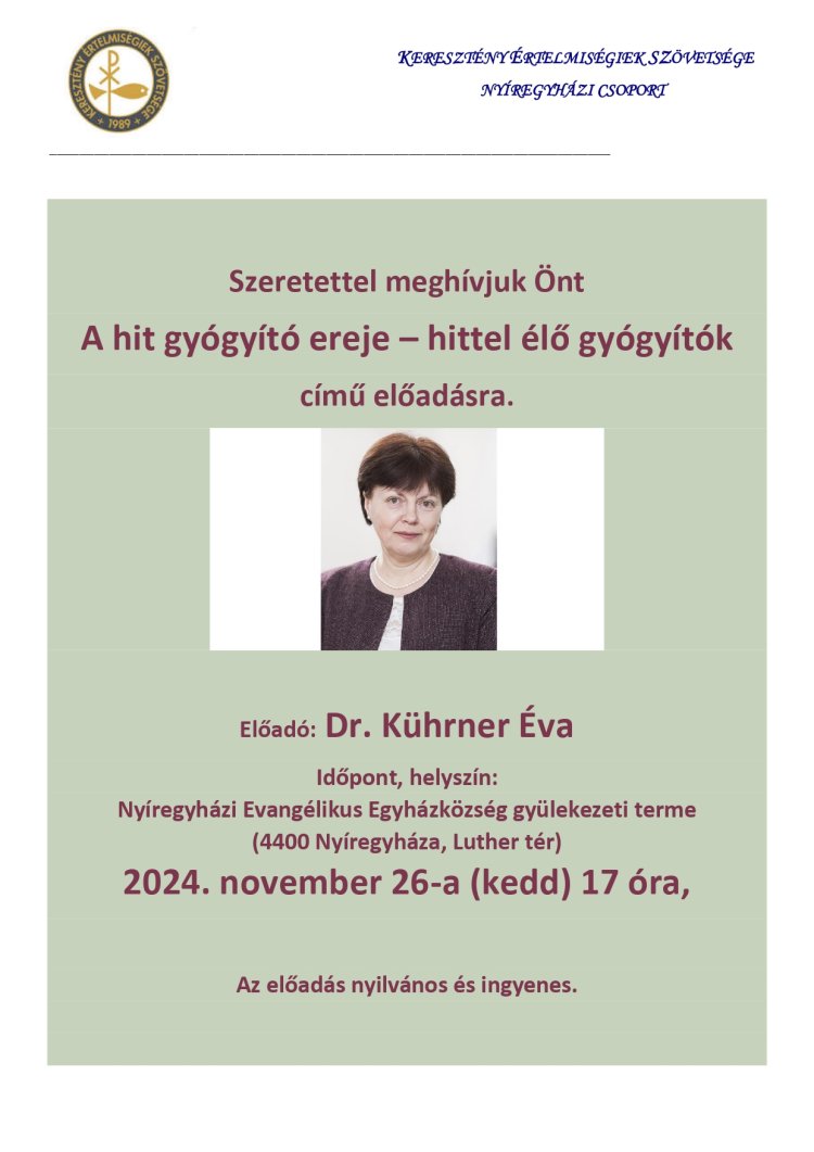 A Keresztény Értelmiségiek Nyíregyházi Csoportja előadást szervez. Az előadás témája: A hit gyógyító ereje - hittel élő gyógyítók.