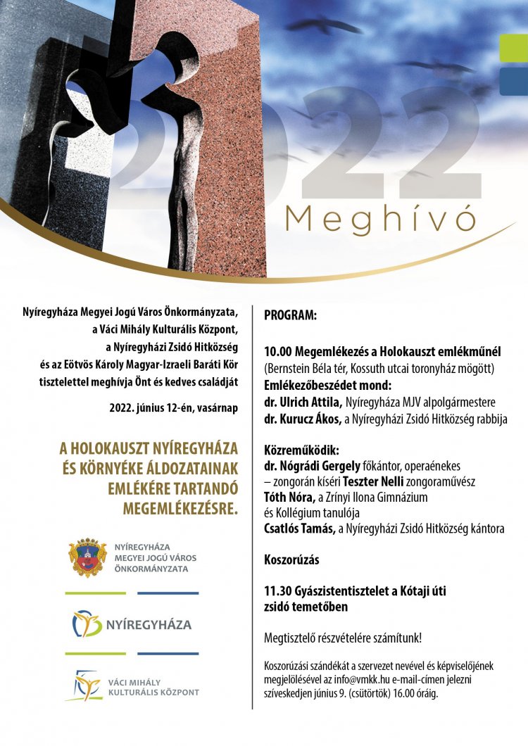 A Holokauszt Nyíregyháza és környéke áldozataira emlékeznek június 12-én a Holokauszt emlékműnél. A megemlékezést koszorúzás követi, majd gyászistentisztelet tartanak a Kótaji úti zsidó temetőben.
