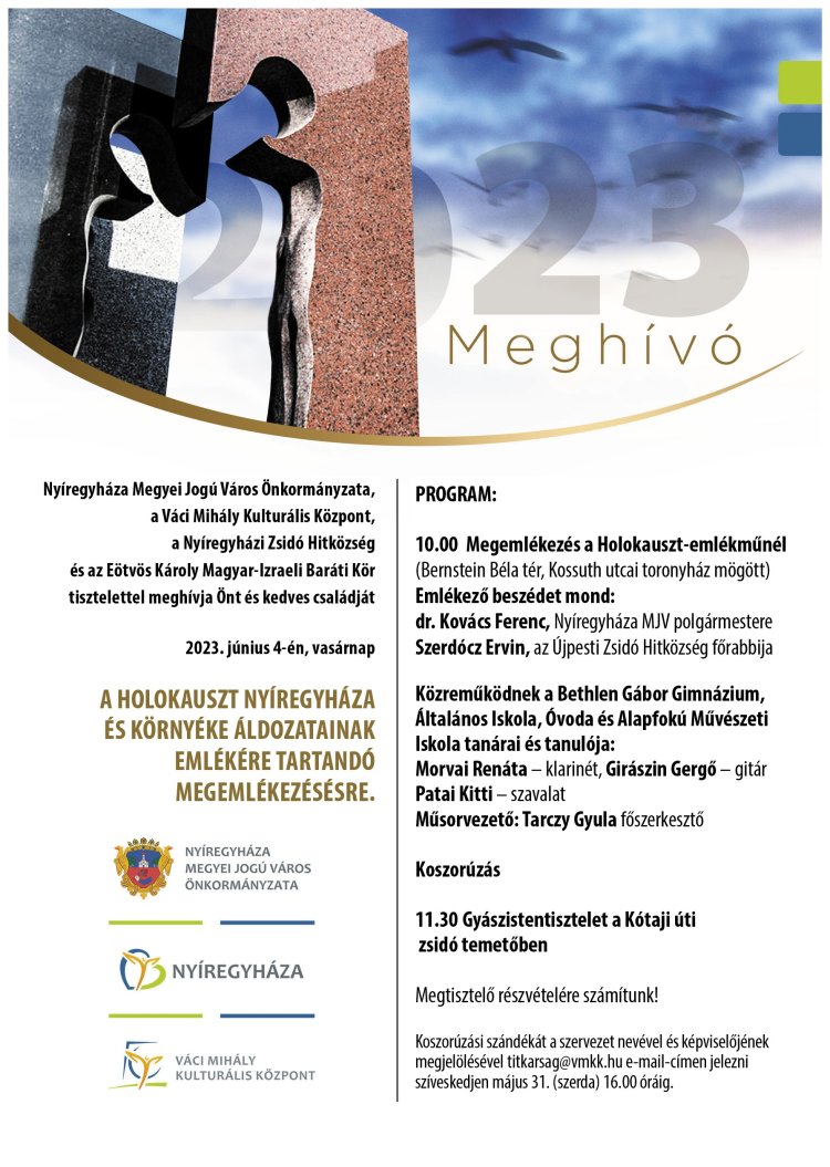 A Holokauszt Nyíregyháza és környéke áldozataira emlékeznek június 4-én a Holokauszt emlékműnél. A megemlékezést koszorúzás követi, majd gyászistentisztelet tartanak a Kótaji úti zsidó temetőben.