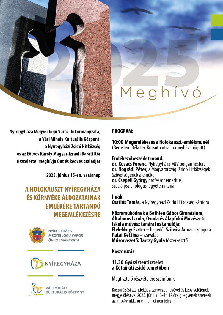 Nyíregyháza Megyei Jogú Város Önkormányzata, a Váci Mihály Kulturális Központ, a Nyíregyházi Zsidó Hitközség és az Eötvös Károly Magyar-Izraeli Baráti Kör június 15-én a Holokauszt Nyíregyháza és környéke áldozataira emlékezik.
