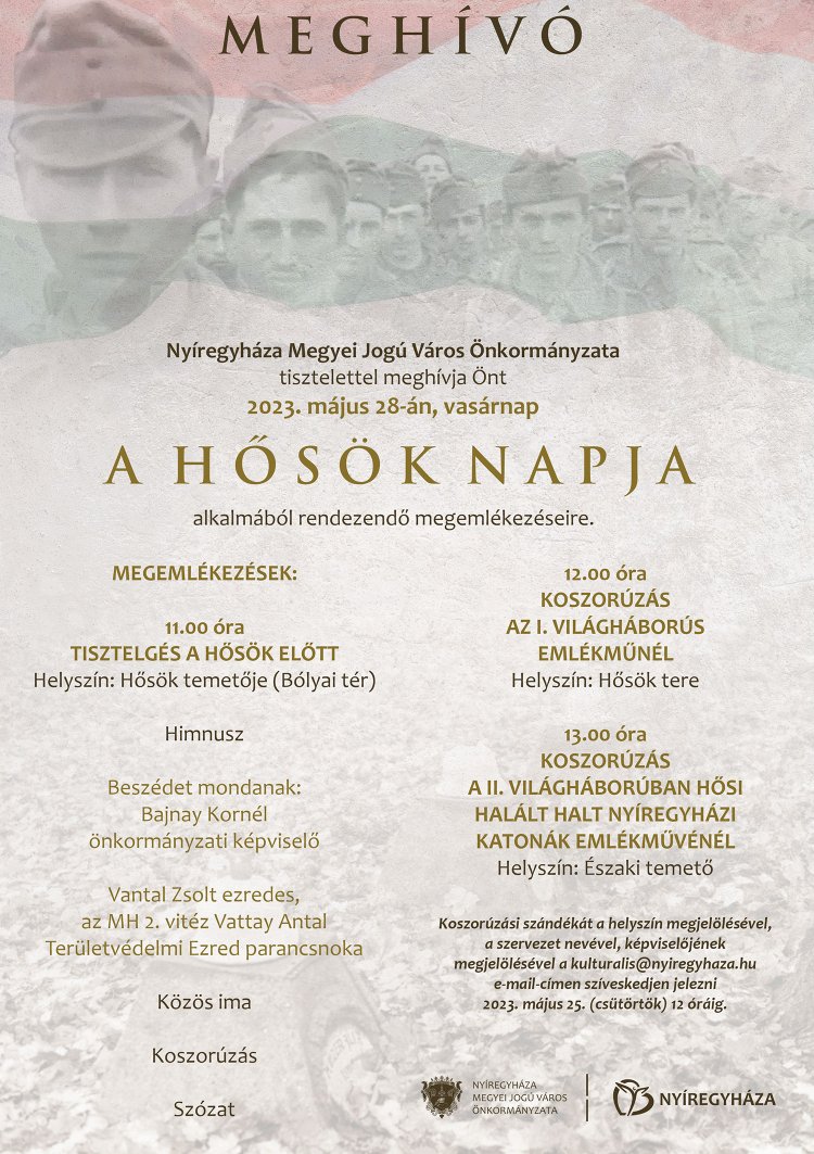 Nyíregyháza Megyei Jogú Város Önkormányzata megemlékezéseket tart a Hősök Napja alkalmából május 28-án.