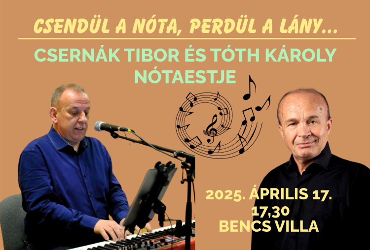 Csendül a nóta, perdül a lány – Csernák Tibor és Tóth Károly, a Móricz Zsigmond színház színművésze népszerű magyar nótákkal várja a közönséget a Bencs Villában április 17-én, csütörtökön. Az est folyamán többek között a Hajlik a nóta, hajlik a lány; a Nótás kedvű volt az apám és a Galambszívet örököltem című nótákat hallhatják.