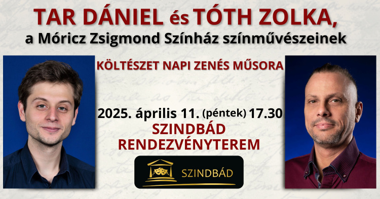 Április 11-én, pénteken a magyar költészet napján Tar Dániel és Tóth Zolka színművészek várják a nézőket a Szindbád Rendezvényteremben, ahol zenés és prózai művekkel tisztelegnek a magyar irodalom előtt.