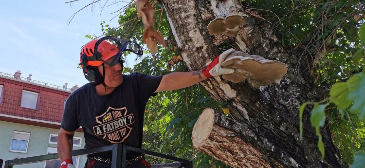 A fa törzsén lévő taplógombákat eltávolították, és a keletkezett sebeket leápolták, így tovább élhet a kellemes árnyékot biztosító nyírfa.