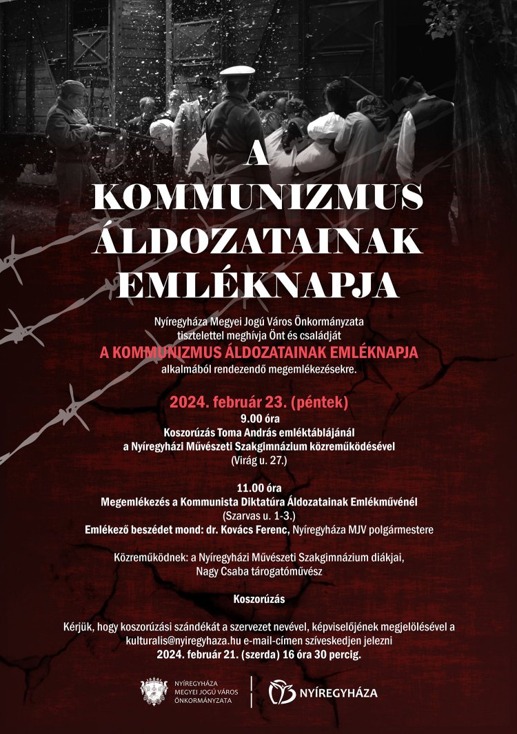 Nyíregyháza Megyei Jogú Város Önkormányzata minden kedves érdeklődőt meghív február 23-án (pénteken), a Kommunizmus Áldozatainak Emléknapja alkalmából rendezett megemlékezésekre.