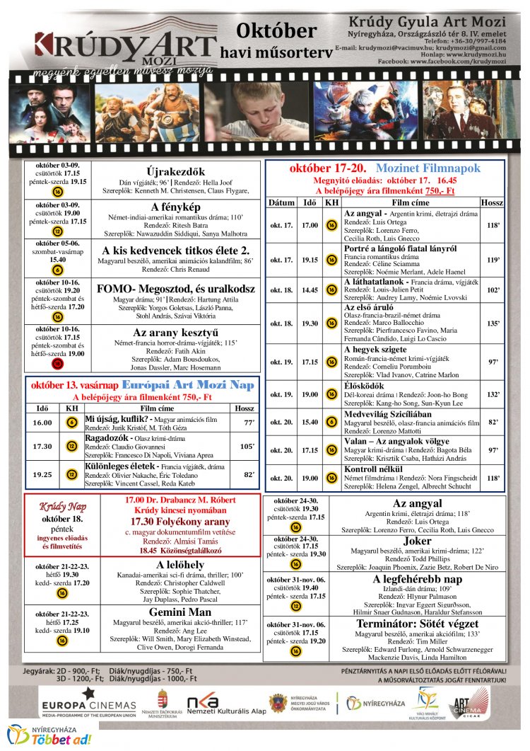 A Gemini Man és a Terminátor: Sötét végzet című filmek is szerepelnek a művész mozi októberi műsortervében, de tartanak Európai Art Mozi Napot is, valamint Mozinet Filmnapok is várják a filmkedvelő közönséget.