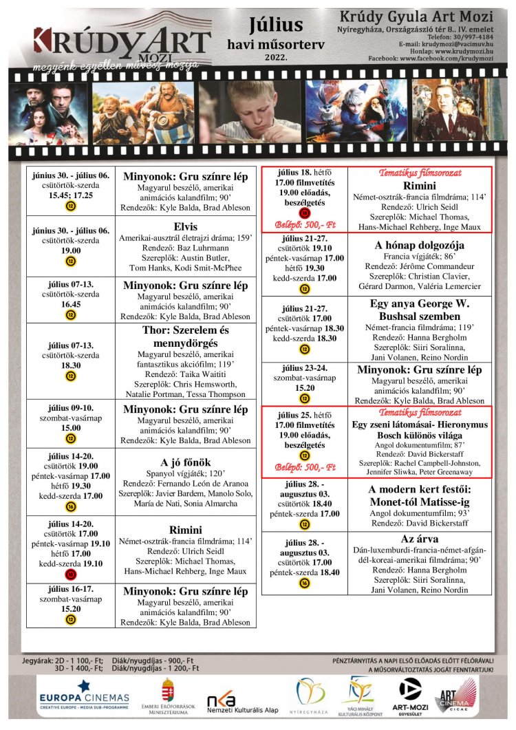 A Krúdy Gyula Art mozi júliusi műsorterve