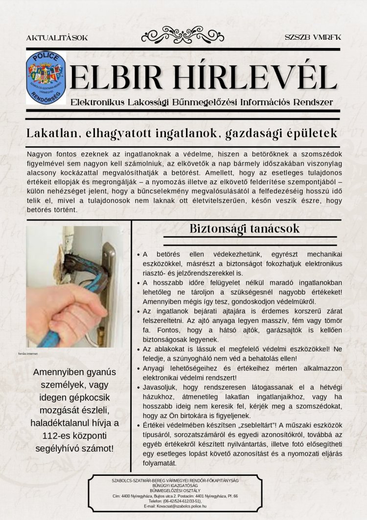 A lakatlan, elhagyott ingatlanok és gazdasági épületek védelmére hívja fel a figyelmet a rendőrség