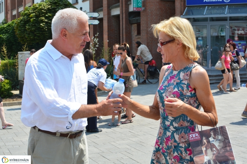 A hőségriasztás miatt a Nyírségvíz Zrt. munkatársai ma és holnap a Kossuth téren vizet osztanak, Nyíregyháza polgármestere pedig palackozott ásványvíz osztását rendelte el a Dózsa György utca–Nagy Imre tér találkozásánál, ahol a közterület-felügyelők kínálják vízzel a járókelőket.