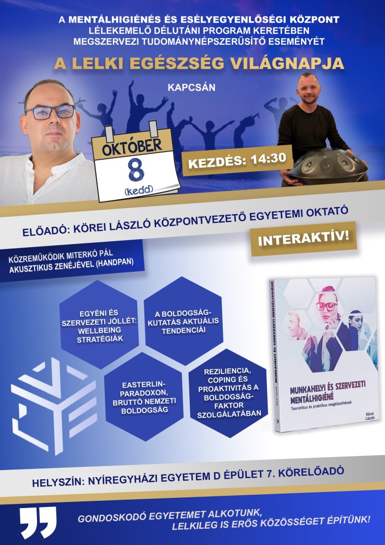 A Mentálhigiénés és Esélyegyenlőségi Központ lélekemelő délutáni program keretében szervezi meg tudománynépszerűsítő eseményét a lelki egészség világnapja kapcsán a Nyíregyházi Egyetemen.