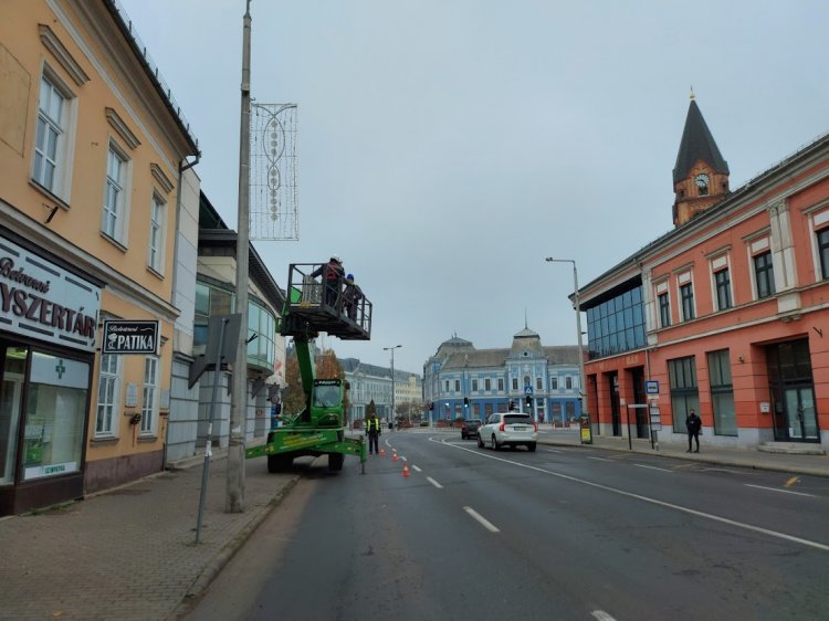 A Luther utcán is megkezdődött a karácsonyi díszek felszerelése, amelyet forgalomkorlátozás mellett végeznek a NYÍRVV munkatársai.
