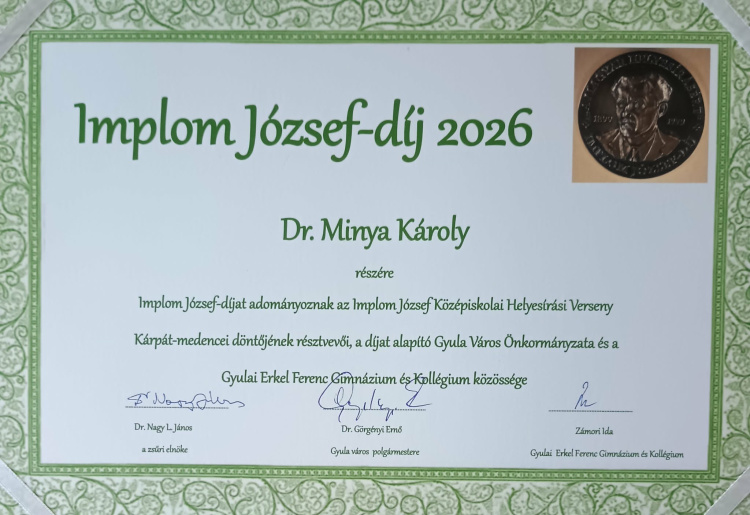 „A magyar helyesírásért” Implom József-díjjal ismerték el dr. Minya Károly munkásságát a 37. Implom József Középiskolai Helyesírási Verseny Kárpát-medencei döntőjén. A Nyíregyházi Egyetem főiskolai tanára több évtizedes szakmai tevékenységével járult hozzá a magyar helyesírás ügyéhez.