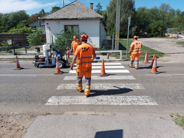 A korábban kialakított gyalogátkelőhely festését végzik, amelynek eredményeként egy biztonságos, fényvisszaverő, modern zebrát használhatnak ezentúl a gyalogosok.