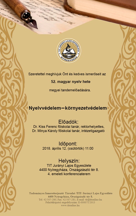 Április 12-én Nyelvvédelem-környezetvédelem címmel kerül megrendezésre az 52. magyar myelv hetének tandemelőadása, melyen Dr. Kiss Ferenc és Dr. Minya Károly tart előadást.