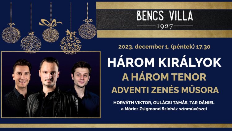 A 3 tenor a Bencs Villában lép ismét színre. December 1-én, pénteken 17.30 órától újra fellépnek a Móricz Zsigmond Színház színművészei: Horváth Viktor, Gulácsi Tamás, Tar Dániel ezúttal advent alkalmából énekelnek a közönségnek.