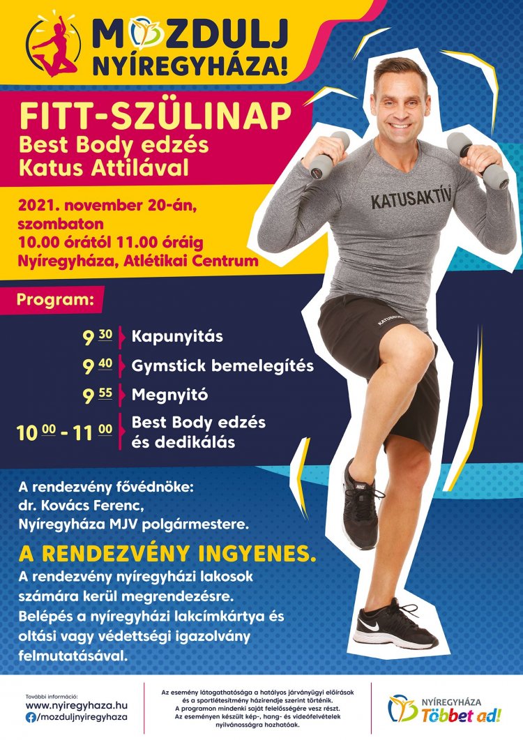 A „Mozdulj Nyíregyháza!” programsorozat idén ünnepli 8. születésnapját. Ez alkalomból november 20-án szeretettel vár minden nyíregyházi érdeklődőt a „Fitt-Szülinap” program, melynek keretében Katus Attila 60 perces Best Body edzést tart.