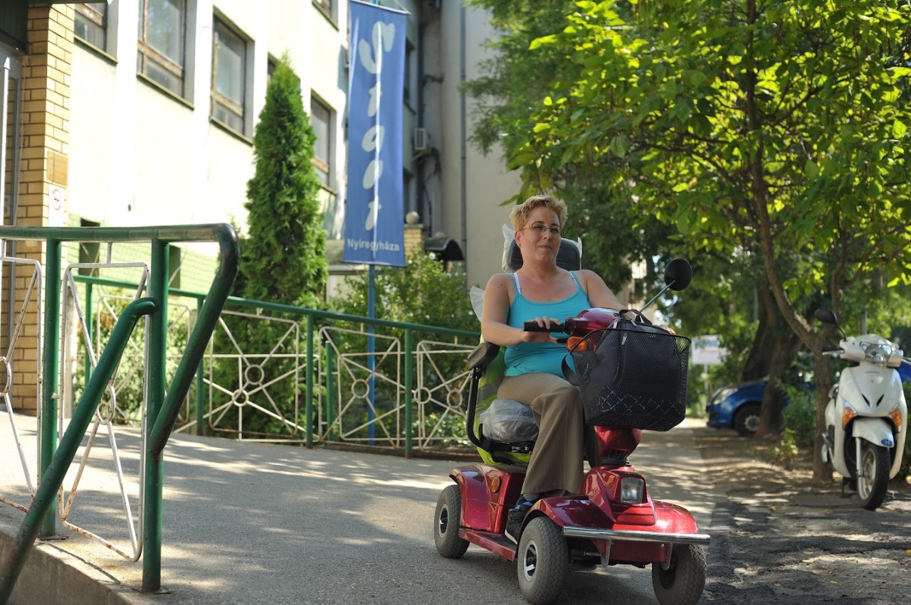 Erzsike látszólag teljesen egészséges embernek tûnik. Boldog kapcsolatban él, háztartást vezet, edzõterembe jár, dolgozik, szükség esetén pedig tömegközlekedéssel is képes közlekedni. Csak egy, a közelében parkoló piros elektromos hajtású moped – mozgássérült segédeszköz – hívja fel a figyelmet arra, hogy a mindennapi életben segítségre van szüksége. Igaz, csak az utcán használja, mert hosszú távon képtelen a gyaloglásra.